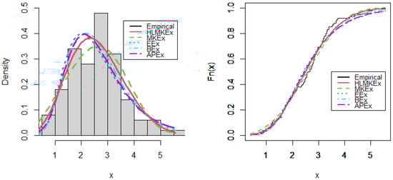 Further, we shall compare the fits of the HLMKEx distribution with other models: MKEx, exponentiated exponential (EEx) [], beta exponential (BEx) [] and alpha power exponential (APEx) [] models. The PDFs of these models are provided by the following: