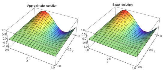 Table 1 shows the absolute error (AE) for and at different values of t. Additionally, a comparison of the MAE is tabulated in Table 2 between our method and the method presented in [51] for . A comparison of the MAE for is tabulated in Table 3 between our method and the method presented in [50]. Furthermore, for and , we plot two figures. Figure 1 shows the approximate solution (left) and exact solution (right), while Figure 2 shows the contour of absolute errors.