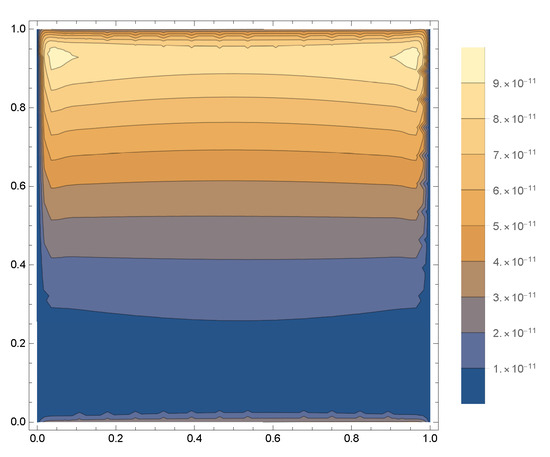 For and , we plot two figures. Figure 5 shows the error, while Figure 6 shows the contour of absolute errors. Table 7 shows the AE for and at different values of t. Table 8 shows the MAE at different values of γ and N. A comparison of the MAE is tabulated in Table 9 between our method and the method presented in [51] for . Finally, a comparison of the MAE is tabulated in Table 10 between our method and the method presented in [50] for and .