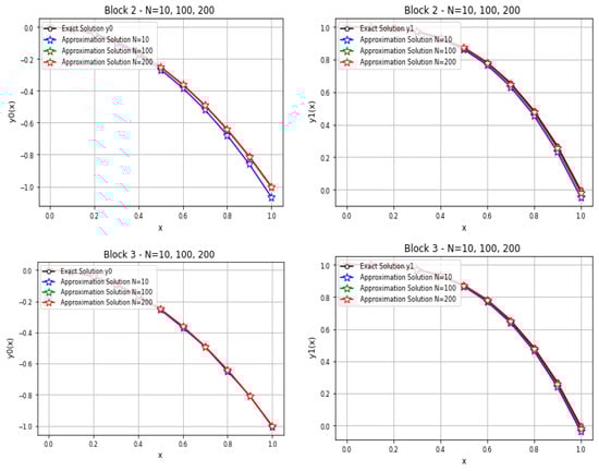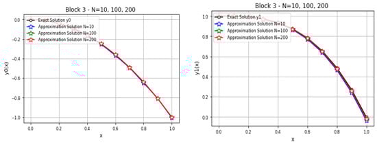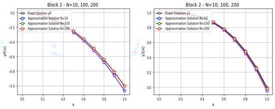 As a result, at each step (at each ), we get simultaneous equations with the same number of unknown functions, i.e., we will have two-block systems with unknowns from Equations (7) and (8). As a consequence, we must establish the block of unknowns and with all for all with each . So, in order to obtain the solution of the linear system of VIFDEs using the Python program (V 3.8.8), we wrote the following algorithm (BMP2).