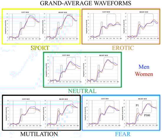 In an fMRI study using IAPS pleasant, neutral, and unpleasant pictures, women showed greater activation in the right extra-striate visual cortex when viewing unpleasant compared to pleasant pictures, whereas men showed greater activation for pleasant vs. unpleasant stimuli []. Similarly, we always observed the activation of Broadmann areas 18–19 during picture processing; however, both the left and right hemispheres were differently recruited by men and women. Importantly, in our research, we did not contrast positive and negative stimuli with neutral ones because our aim was to describe the neural underpinnings elicited by each emotion in the two samples. Indeed, in our experimental paradigm, the number of positive and negative stimuli was twice the number of neutral images: the greater amount of emotional pictures probably affected the processing of neutral stimuli, inducing a physiological activation similar to that of positive-valenced stimuli. Future studies should consider choosing a block design, in which stimuli with the same content are grouped together. However, it is interesting to note that only during emotional processing (i.e., erotic, fear and mutilation stimuli) was the P1 amplitude in the right posterior cluster higher for women than men, whereas similar amplitudes were found for the neutral control pictures. It has been proposed that the P1 component might be considered an index of attention allocation to valenced stimuli, and its amplitude was measured while participants evaluated pleasant and unpleasant images []. The results provided evidence for the extremely rapid (<120 ms) discrimination of positive and negative stimuli: P1 amplitudes to frequent stimuli and to rare negative stimuli were larger than P1 amplitudes to rare positive stimuli. Our data showed that two conditions in particular (i.e., erotic and mutilation) elicited the maximum P1 amplitude compared to other stimuli, with right hemispheric lateralization for women only. This increased amplitude is in line with previous visual-evocated potential studies reporting that early components (e.g., P50, N70 and P100) have greater amplitudes in women compared with men (for a review, see []). Hemispheric asymmetry for visual scene processing has been reported in an fMRI study showing that the right hemisphere is specialized in form-specific visual processing and the left hemisphere in form-abstract visual processing [].