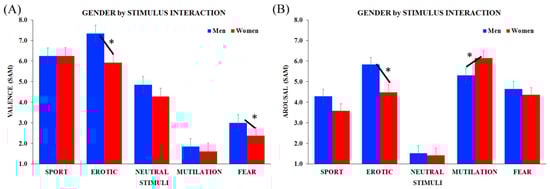 Analyses of participants’ subjective evaluations through self-assessment manikin (SAM). Significant gender x stimulus interaction for (A) valence and (B) arousal scores in men (blue) and women (red). Bars depict standard errors [SE], asterisks significant post hoc comparisons.