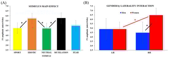The only case in which there were no significant P1 results was for the sports category. For the erotic stimulus category, the 2-way interaction gender x laterality was found (F1, 38 = 6.92, p = 0.01): as shown in Figure 5A (in orange), women showed greater P1 amplitude in the right vs. left cluster (p = 0.048) but also greater amplitude than men in the right hemisphere cluster (p = 0.006). No laterality effect was found for the men’s group.