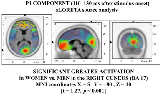 The source analysis carried out on the P1 components, including all stimuli between groups (thus following the ERP results), showed a significantly greater activation in women vs. men (t = 1.27, p < 0.001) in MNI coordinates X = 5, Y = −80, Z = 10, corresponding to the right cuneus (Brodmann area, BA, 17; see Figure 4).