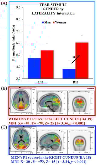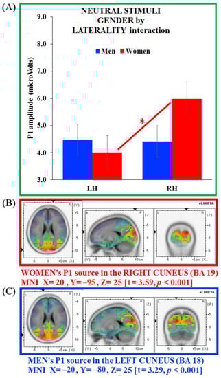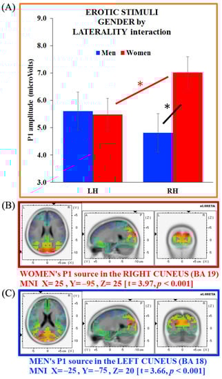 As the between-group sLORETA analysis carried out on the P1 showed no significant gender differences, we carried out separate analyses on women’s and men’s P1 generators (erotic pictures). These latter analyses revealed a neural generator in the right cuneus (BA 19, MNI X = 25, Y = −95, Z = 25; t = 3.97, p < 0.001) for women, and in the left cuneus (BA 18, MNI X = −25, Y = −75, Z = 20; t = 3.66, p < 0.001) for men. Therefore, the P1 generator appeared located in the cuneus in both groups, with an opposite hemisphere engagement for women (right side) and men (left side; Figure 5B,C, respectively).