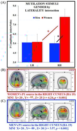 sLORETA analysis carried out on each group showed a neural generator in the right cuneus for both women and men (BA 19, MNI X = 20, Y = −95, Z = 25; t = 4.24, p < 0.001; and BA 19, MNI X = 20, Y = −80, Z = 30; t = 3.57, p < 0.001, respectively). Therefore, unlike erotic and neutral images, mutilation images activated the right cuneus in both groups, thus revealing that this kind of emotional content is not affected by gender bias (Figure 7B,C, for women and men respectively).