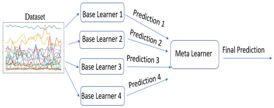 An ensemble approach includes various forecasting models, each of which is stated as a base forecaster or expert forecaster, to forecast the expected occurrence of an event. The estimations of each expert are combined using a new model to calculate the ensemble’s final result. Figure 2 shows the theoretical layout of an ensemble-based anticipating approach. The objective of the ensemble learning approach is to boost prediction accuracy or overall performance by combining decisions from various base predictors into a new model. MaxVoting, averaging, extreme gradient boosting (XGB), weighted averaging, gradient boosting machine (GBM), stacking, blending, adaptive boosting (AdaBoost), bagging, boosting [47], and other ensemble learning methods are just a few examples. Various ensemble models have distinct traits and can be applied to address distinct challenges across a range of domains.