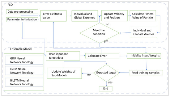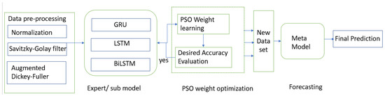 The proposed PSO ensemble model consists of three primary steps: (1) modeling the base prediction model with common recurrent neural network models, i.e., GRU, LSTM, and BiLSTM, (2) optimizing the weights of the base models using a meta-heuristic optimization algorithm, i.e., particle swarm optimization (PSO), and (3) integrating the sub-models/base models. The ultimate forecasting is generated by the meta/learning model, which is fed predictions from the individual networks.