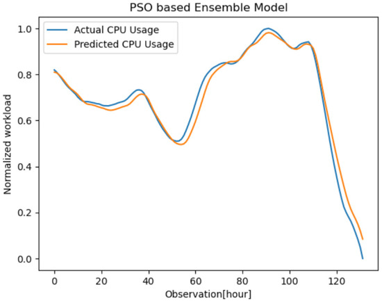 The experimental result of the sub-models and the proposed PSO-based ensemble model is illustrated in Table 4, Table 5, Table 6 and Table 7. The proposed model has a lower forecasting error than the sub-models LSTM, GRU, and BiLSTM. It reduces prediction error by 79.72–91.95% and 82.64–86.91% on the RMSE metric as is shown in Table 4 and Table 5 for the GWA-T-12 dataset and PlanetLab trace, respectively. Throughout the experiments, we compared the predicted CPU utilization of the four VMs with their actual CPU utilization and calculated the MAE, MAPE, and RMSE values. The predicted values can be used to anticipate the CPU usage of the VMs for the next hour. As a result, VM resources can be effectively managed due to the efficient allocation of resources, such as CPU, to the VMs hosting the workloads on demand. The proposed blended PSO ensemble model is compared with the sub-models LSTM, BiLSTM, and GRU, which are widely used by cloud service provider centers for predicting future resource workloads in order to automatically provide resources on demand and revoke user resources for the system in advance in order to meet service level agreements. On the basis of the experimental findings, the proposed PSO ensemble model outperforms the competition. The MAE is 2.207, the MAPE is 0.545, and the RMSE is 3.146, as shown in Table 6. A similar comparison is made between the three sub-models and the performance of the suggested model on the mean CPU usage of the PlanetLab traces of data using the MAE, MAPE, and RMSE. The experimental data demonstrate that, in comparison to the individual models, the suggested PSO ensemble model reduces error by 86.91%. The outcomes show that the suggested method generates forecasts with a higher degree of accuracy. The findings of the experiment are detailed in Table 6 and Table 7. As demonstrated in Table 4, Table 5, Table 6 and Table 7, the proposed blended PSO ensemble model is superior compared to all other models in every metric. The blended PSO-based ensemble model significantly improves MAE, MAPE, and RMSE values.