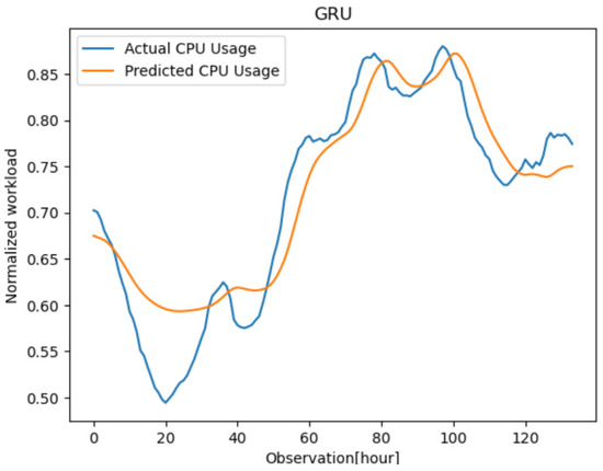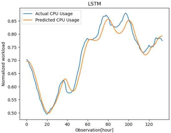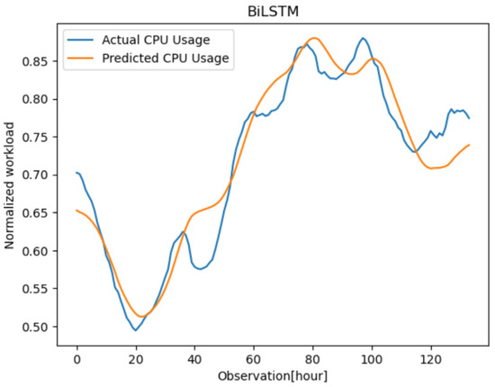 As shown in Equation (1), the extraction of sequence information from the workload traces of the virtual machines was required to predict the time information at , where is the desired horizon after the current time stamp that we manually set. The proposed forecasting model’s objective is to reduce the difference (error) between the predicted CPU usage value and the actual CPU usage for each time.