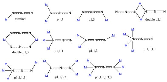 - Escuer, A.; Aromí, G. Azide as a bridging ligand and magnetic coupler in transition metal clusters. Eur. J. Inorg. Chem. 2006, 2006, 4721–4736. [Google Scholar] [CrossRef]