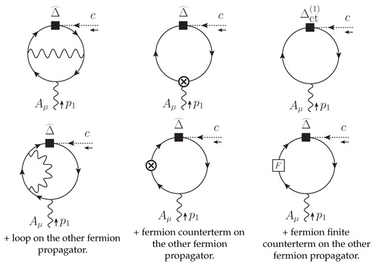 - A second way to rewrite the Slavnov–Taylor identity (85) is by taking derivatives with respect to the sources as in Equation (66) to obtain identities for specific Green functions. In this way, Equation (85) leads to infinitely many identities of the kind:where the first line is defined as an abbreviation for the second line and the uniform + signs of all terms are correct because the transformation as defined by Equation (83) is of a bosonic nature. In these identities, Green functions involving ordinary fields and the symmetry transformation composite operators appear. In this form, Slavnov–Taylor identities may be checked explicitly by computing Feynman diagrams for such Green functions. We can illustrate this with a simple, but important example. Taking the Yang–Mills theory of the previous subsections with fermionic matter fields , we can consider and use the BRST transformations in Equations (51a) and (53) to obtainwhere the brackets indicate local composite operators. The auxiliary field B will effectively be replaced by via Equation (56). In Abelian QED, the ghosts are free and can be factored out of the matrix elements. Hence, in QED, this identity simply leads to the familiar Ward identity between the electron self-energy and the electron–electron–photon vertex function. In non-Abelian Yang–Mills theories, the identity also relates the fermion self-energy and the fermion–fermion–gauge boson three-point function, but the relationship is more complicated and involves nontrivial composite operators, which need to be renormalized.