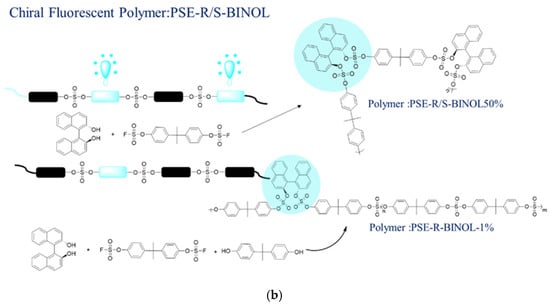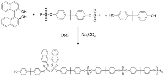 Since the click reaction was first reported by Karl Barry Sharpless’s group in 2001 year [10], more and more scientists have been trying to figure out how to make and use other click chemical reactions to make small molecules and polymers. The sulfur–fluoride exchange reaction is one efficient click reaction discovered in recent years [11,12]. Due to the sulfate structure formed, the sulfur fluoride exchange reaction has the characteristics of high efficiency, mild reaction conditions, and stable chemical properties. In recent years, scientists and engineers have invested great interest in sulfate materials. Due to its good pollution resistance, sulfate materials have successfully prepared membranes for wastewater treatment [13,14,15], which could be inferred to replace commercial materials such as polysulfone and PVDF. SuFEx click chemistry was also used to synthesize polysulfate-bound MacMillan catalysts and selectivity in the asymmetric Diels–Alder (DA) reaction [16]. Furthermore, there are few reports on how to design and make polysulfate materials with fluorescent properties through sulfur–fluoride exchange copolymerization directly, especially sulfate fluorescent materials with a chiral structure, which is needed to make membranes and catalysts for wastewater treatment. Only one paper reported the fluorescent materials prepared by the post-modification method by clicking sulfur–fluorine exchange reaction [17]. Therefore, it is essential to expand the application of sulfate materials and study the luminescent properties of fluorescent copolymer materials. Chiral binaphthol structure and its derivatives often design and synthesize materials with fluorescence properties and chiral structure, such as Zn (II)-coordination fluorescence enhancement binaphthol polymer [18,19,20,21]. However, as far as I know, no paper has reported how to construct sulfate materials with stable chemical properties by binaphthol molecule, especially designing chiral fluorescent polymers using binaphthol structure as the main monomer for copolymerization through sulfur–fluoride exchange reaction. We introduced R/S binaphthol into the polysulfate material skeleton through a sulfur–fluoride exchange copolymerization reaction so far in this work. We studied polymer and property influence (Figure 1) resulting from the different amounts of binaphthol were added to the fluorescent polysulfate. It lays the foundation for future research for preparing luminescent materials from polysulfate polymers, especially fluorescent chiral polymer devices with bio-targeted detection and separation.