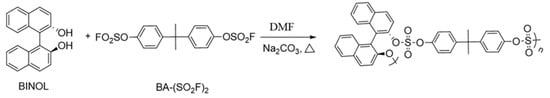 The chiral binaphthol polysulfate fluorescent polymers PSE–R–BINOL1% was synthesized following a literature procedure as Figure 3. The solution of R–BINOL (1 mmol, 0.286 g) and BA (99 mmol, 22.572 g) in 90 mL DMF was stirred with a mechanical agitator at 170 °C in the oil bath. Then the BA–(SO2F)2 (100 mmol, 39.2 g) was added to the mixture and Na2CO3 (22 mmol, 23.32 g) was added. The mixture appeared with lots of CO2 bubbles and was stirred at this temperature for another 6–8 h. After the viscosity of the reaction mixture reached a certain degree, the mixture was cooled to 100 °C and poured into hot deionized water (60 °C) for precipitation to get a white solid crude product. Then the crude product was dissolved in chloroform and precipitated with ethanol 3 times. Finally, the white powder was obtained by being extracted with hot deionized water and ethanol for 24 h. The pure product was dried in a vacuum for 5 h to obtain the solid white powder PSE–R–BINOL1% (52.8 g, yield 91%), PSE molecular weight: Mn = 33,937 g/mol. 1H-NMR (CDCl3, 400 MHz) δH:7.32~6.70(m, 1H), 1.82~1.50(m, 1H). 13C NMR (400 MHz, CDCl3) δ: 150.03~148.36, 128.40, 120.65, 42.78~42.76, 30.80.