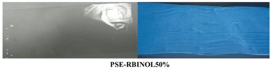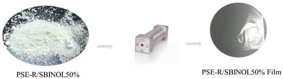 The fluorescent transparent film fabrication process of PSE–R/S–BINOL50% is shown in Figure 4. The white PSE–R/S–Binol polymer powder (2 g) was dissolved in THF 10 mL. The solution was stirred vigorously to form a uniform polymer gel solution. The gel solution was put on the desk for a few minutes until the bubbles basically disappeared, and then put the mixture of 2 mL was on the PET release film, then used a film scraper to scrape the film, put the coated film for another 5 min, put the coated film in a vacuum oven to dry another 10 min at 70 °C, the PSE–R/S–Binol polymer film was separated from the PET release film to obtain PSE fluorescent transparent film.