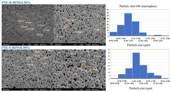 PSE–R/S–Binol polymer powder (1 g) was dissolved in dichloromethane 8 mL as the oil phase. The oil phase was then added into 50 mL pva (Mn = 8000 g/mol, 1% aqueous solution), the mixture was ultrasonic for another 10 min, stirred at room temperature for another 12 h, and the product obtained by centrifuge. The microspheres were washed with ethanol, and deionized water and then dried in a vacuum oven to obtain solid microsphere powder. The powder was dispersed in ethanol and dropped on the silicon chip to observe its SEM. The SEM showed that in Figure 5 below. Both R/S polymers could be emulsified to form microsphere particles. 100 microsphere was selected for size measurement in Figure 5. We found that the size of the microspheres of more than 80% was between 0.78 µm and 1.56 µm prepared by this method. The microsphere distribution of S–BINOL is slightly wider than that of R–BINOL, which the molecular weight difference may cause. This method lays a good foundation for the polymer to prepare fluorescent microspheres and provides a good path for biological fluorescence detection in the future.