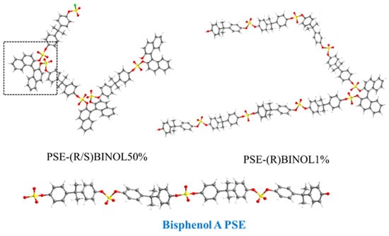 In this work, asymmetry C2 axis molecular BINOL was copolymerized into BisphenolA PSE to break its regularity. As shown in Figure 6, the structure of bisphenol A copolymerized with R/S–BINOL (mole ratio = 1:1) becomes a twisted one-dimensional chain simulated with gaussian software. Even when a small amount of BINOL monomer (BA:BINOL = 99:1 (mole ratio)) is inserted into the BisphenolA PSE polymer chain, it could not change the order state of local polymer segments. However, it could also change the polymer’s long-range order and 3D stacking state.