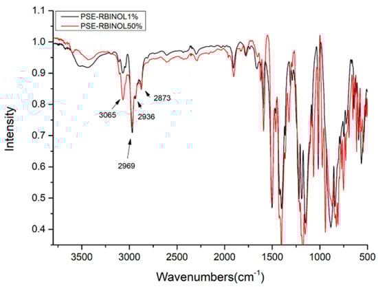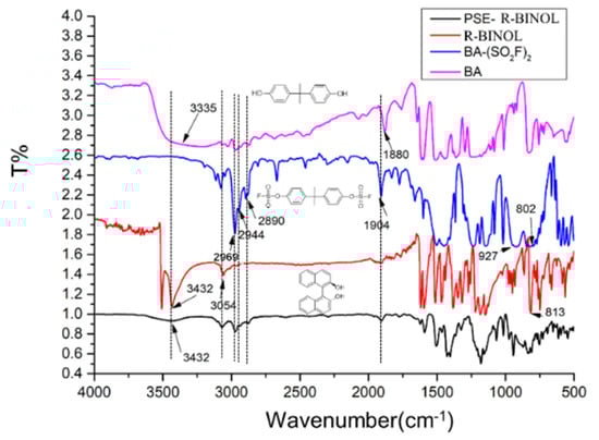 The blue line shows the infrared spectra of the monomers shown in Figure 7 (bisphenol A, binaphthol, FO2S–BA–SO2F) and PSE–R–BINOL50% polymer represented the infrared spectrum of FO2S–BA–SO2F monomer, which was obtained by the reaction of bisphenol A and sulfuryl fluoride under organic base present. Therefore, the signal near 3335 cm−1 disappeared in the infrared spectrum while the signal at 1904 cm−1 may be the signal of the appeared acyl halide structure. It is speculated that this is the vibration of (O=)2S–F structure, and it is proved that the structure of FO2S–BA–SO2F. In addition, compared with the binaphthol, the signal of PSE–R–BINOL50% materials near 3432 and 3054 cm−1 proved that the binaphthol structure had been successfully introduced into BisphenolA PSE. Compared with the infrared spectrum of PSE–R–BINOL50%, the signal near 3065 cm−1 of PSE–R–BINOL1% in Figure 8 showed that there was less amount of binaphthol molecules copolymerized into the BisphenolA PSE.