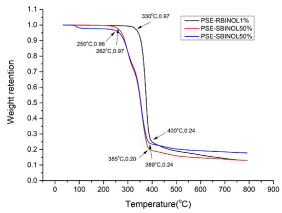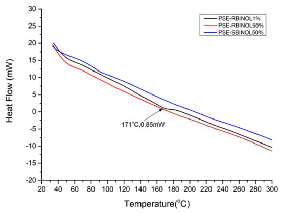 We know that the bisphenol A PSE (Figure 6) is a kind of polymer with part crystallinity. In this work, we introduced asymmetry C2 axis molecular binaphthol into the bisphenol A PSE to destroy its molecular regularity, which could change its thermodynamic properties. From the thermodynamic curve in Figure 9 and Figure 10 below: while just a few binaphthol monomers (1% molar of bisphenol A) were copolymerized into the bisphenol A PSE, the decomposition temperature of the PSE–R–BINOL1% was about 330 °C and its glass transition temperature was about 171 °C that was higher than the glass temperature of bisphenol A PSE. When the copolymerization ratio of the binaphthol was increased to 50% (bisphenol A:binaphthol = 1:1 (mole ratio)), the glass transition temperature and the decomposition temperature decreased significantly (Figure 9 and Figure 10). The decomposition temperature curves of PSE–R–BINOL50% and PSE–S–BINOL50% are basically the same after the R/S binaphthol copolymerization into bisphenol A PSE. Simulation was based on thermodynamic data and polymer molecular chain model in Figure 6. It might be inferred that when less binaphthol copolymerized into the bisphenol A PSE, it could slightly damage the crystalline state of bisphenol A PSE and the large chiral steric structure would entangle the bisphenol A PSE molecular chains. Therefore, the glass transition temperature was increased. When a large amount of binaphthol copolymerized into the bisphenol A PSE molecular chain, the regular structure was almost completely broken, and the polymer could become an amorphous state. Thereby, the glass transition temperature was significantly reduced. In addition, when the number of binaphthol molecules copolymerized into the bisphenol A PSE molecular chain increased, disordered molecular stacking could produce more hydrolysis holes which might affect the polymers’ chemical and thermal stability. Figure 9 displayed that the thermal decomposition temperature of PSE–R/S–BINOL50% was lower than that of PSE–R–BINOL1%.