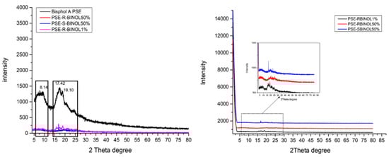 Due to the building blocks (bisphenol A and BA–(SO2F)2) and configuration of the sulfate ester linker, the bisphenol A PSE existed in a certain long-range order. In fact, the stacking between the bisphenol A PSE molecular chains has a certain regularity shown by PXRD (Figure 11). In order to prove that there was no residual reactive monomer in the polymer, the X-ray powder diffraction of the polymers (PSE–R/S–BINOL) compared with the monomers (bisphenol A, binaphthol, FO2S–BA–SO2F) in the Figure 11 and Figure 12. It could be clearly seen that there was no monomer existed in the polymer. Compared with the bisphenol A PSE, PSE–R/S–BINOL became an amorphous state polymer. Chiral binaphthol molecules would destroy the crystallization of the bisphenol A PSE material and change its thermodynamic properties.