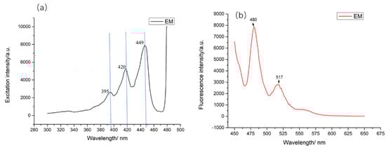 In this work, transparent fluorescent film was prepared by solvent method as shown in Figure 13. The luminescence properties of PSE–R–BINOL50% in the solid state at room temperature were evaluated. Under 254 nm UV light, the photos show that the PSE–R–BINOL50% emit strong blue fluorescence. After the large steric hindrance monomer (binaphthol) enters the bisphenol A PSE polymer, the polymer became transparent under natural light, this work provided a new method for the new transparent fluorescent materials preparation in the future. As shown in Figure 14, PSE–R–BINOL50% was exhibited at 450 nm, the luminescence spectrum of PSE–R–BINOL50% exhibited two distinct characteristic emission peaks at 480 and 517 nm.