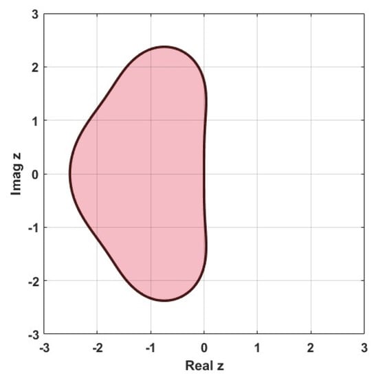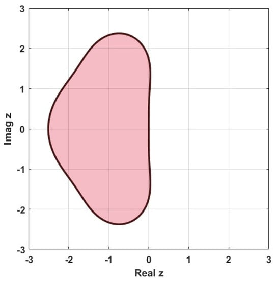 Utilizing the MATLAB software, the stability region of the above formula can be shown graphically in Figure 2 below: