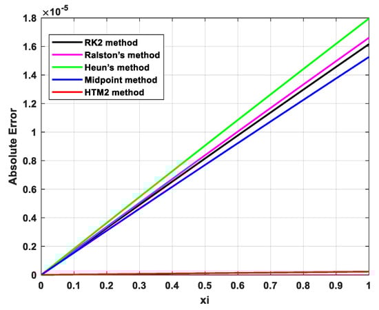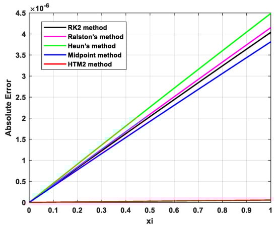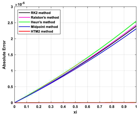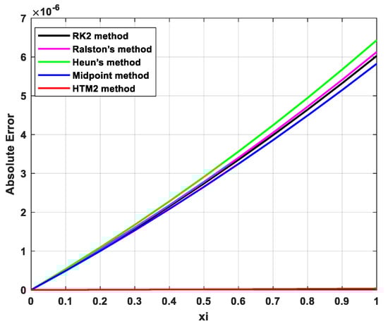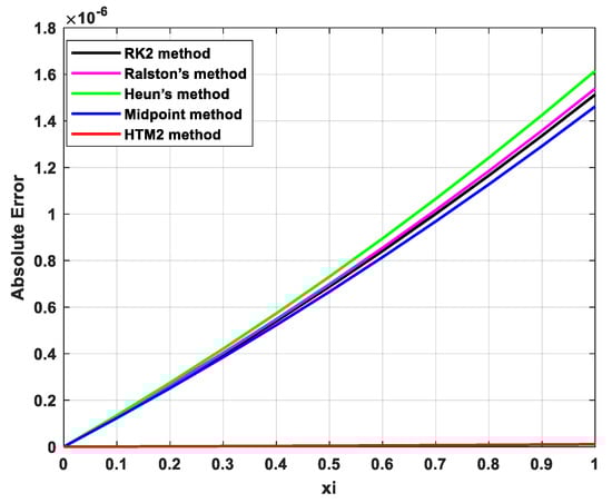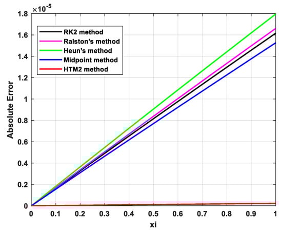 In this section, we solve two initial value problems from the references [18,19] to demonstrate the accuracy and efficiency of the proposed methods in comparison to other relevant methods. We compare the proposed HTM2 method, which is a second-order method, with the RK2 method [15,20], Ralston’s method [15,20,21], Heun’s method [1,15], and Midpoint method [1,15,22]. In addition, we compare the proposed HTM3 method, which is a third-order method, with Ralston’s method [15,20], RK3 method [15,21], and Heun’s method [15,23], using different step sizes ().