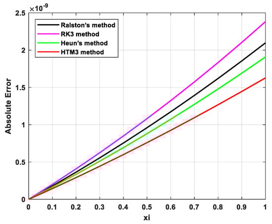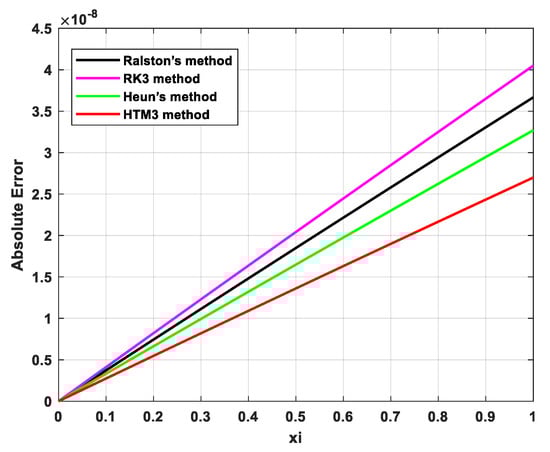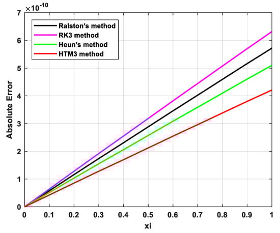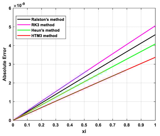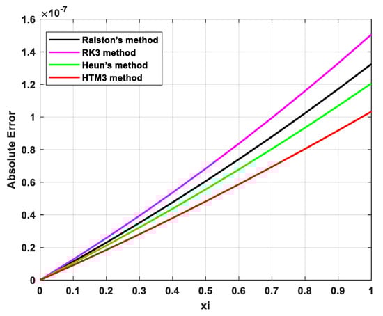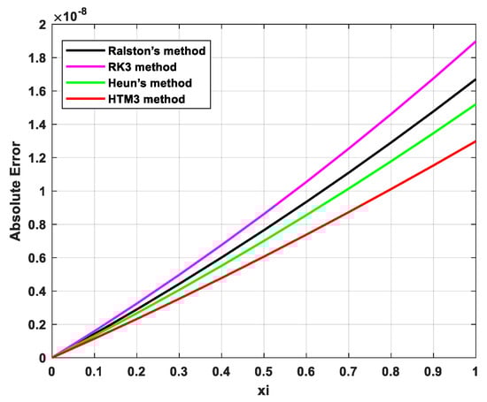 Table 13, Table 14, Table 15, Table 16, Table 17 and Table 18 provide a numerical comparison of the exact solutions and approximate solutions of the proposed methods, HTM2 and HTM3, with other related methods of the same order of convergence using different step sizes , and , respectively. In addition, the numerical comparison of the absolute errors of the proposed methods, HTM2 and HTM3, and other relevant methods of the same order of convergence is presented in Table 19, Table 20, Table 21, Table 22, Table 23 and Table 24. Furthermore, Figure 9, Figure 10, Figure 11, Figure 12, Figure 13 and Figure 14 show the graphical representations of these results, which provide additional support to the numerical results.