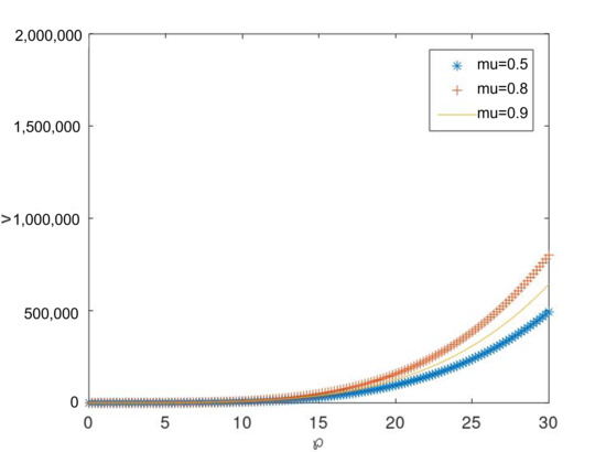Graph of v for case III, with respect to ℘ for different values of , respectively, at a = 0.5, c = 1, .