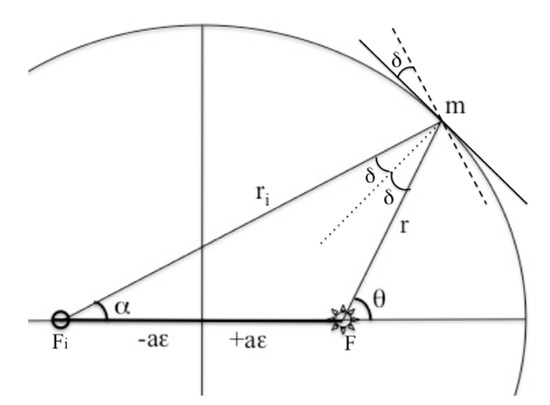 The reflection property of the ellipse requires that a ray emanating from one focus will be reflected to the other, as shown in the expanded view of the ellipse (Figure 2). The triangle whose vertices are the orbiting point m and the two foci, F and Fi, has a vertex angle denoted as 2δ. This construction is useful because the angle between the tangent to the ellipse and the perpendicular to ri (dashed line), which in the limit is parallel to the arc length ridα, is also equal to δ, from inspection of Figure 2. Similar reasoning shows that the angle between the tangent to the ellipse and the perpendicular to radius r (not shown), which is parallel to arc rdθ, is also equal to δ.