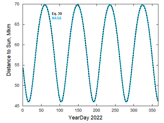 The heliocentric orbit of Mercury in 2022 in position–time coordinates as readily determined from Equation (39) as a dashed black line, compared to ephemeris data for Mercury [24] (solid blue line). The deviation in radial distance of this approximate equation from data is below 0.2%.