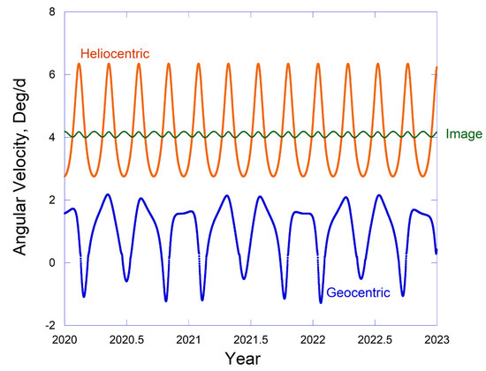 It follows that the angular velocity of Jupiter as seen from Earth is highly variable, varying from +0.2406 deg d−1 (prograde) to –0.132 deg d−1 (retrograde). In contrast, the heliocentric angular velocity is monotonic and varies only by about 10% from its mean value, i.e., from 0.0753 to 0.0917 deg d−1. However, the angular rate about the image focus varies by only ±½ % from its mean value, with a total range of 0.0829 to 0.0837 deg d−1.