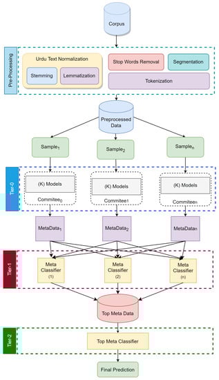 In this section, a Meta learning ensemble model is proposed for Urdu Sentiment Analysis. Five baseline classifiers are trained in tier-0 of 3-tier meta learning architectures. Committees are formed in tier-0. The output from tier-0 is fed intro tier-1. Output of tier-1 is used as input to tier-2 where final predictions are made. By utilizing the idea of meta-classifiers or meta-learners, the proposed ensemble technique combines the predictions of both the inter- and intra-committee classifiers on two separate levels. By utilizing a shallow meta-classifier, committee members can combine their individual baseline classifiers to form a single, more accurate classification. In order to generate meta-classifiers or Tier-1 models, learning algorithms are implemented across all committees. These models attempt to foretell how meta-data should be generated by combining the results of committee-level baseline classifiers (Tier-0 models). In addition, a Tier-2 model, also known as a meta-learner, is created by combining the outputs of the Tier-1 models with a state-of-the-art learning algorithm. We begin with a discussion of the processes involved in cleaning the data and standardizing the text. Later, we discuss the architecture of proposed ensemble model. Last, we discuss the ML/DL models used in ensemble and their parameter values.