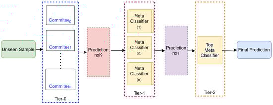 Figure 2 depicts the categorization operation carried out by the trained ensemble model on previously unseen data. When a fresh, previously unseen sample, denoted by the letter x, is introduced to the proposed ensemble technique, a copy of it is first sent across all the committees that make up Tier-0. After that, the committees construct a two-dimensional tensor that contains K columns and n rows of predictions. This tensor serves as the input to the Tier-1 models. These models make a forecast in the form of a vector with n length predictions. The final prediction will be generated using the Tier-2.