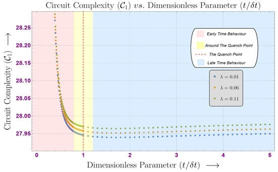 - It is evident from these plots that the unambiguous contribution of the circuit complexity decreases with respect to the dimensionless parameter. When parametrized for different quartic couplings, we find that, initially, the complexity decreases linearly following the same line, irrespective of the quartic coupling. Near to the quench point, the complexity for each quartic coupling diverges and saturates at late times. After the quench point, the complexity after divergence is clearly in direct proportion to the increasing value of the quartic coupling.