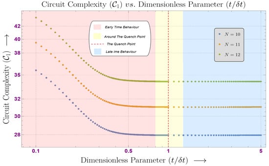where the index . One can insert this expression for the eigenvalues into Equation (30) to obtain the desired value of circuit complexity. We emphasize that the form of these eigenvalues makes the circuit complexity a time-dependent quantity due to the chosen quench profile. This time-dependence of the complexity is explored in numerical plots by choosing an appropriate time scale.