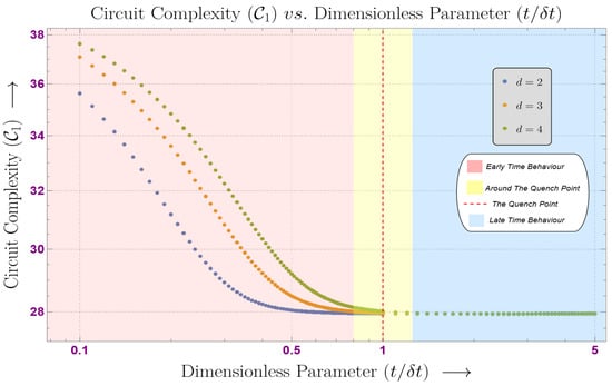In Figure 4, we have plotted the unambiguous contribution of the circuit complexity, , for discretized field theory with respect to the dimensionless parameter for different numbers of dimensions, viz., and 4 (keeping the quartic coupling fixed at and the number of oscillators at ). For a particular d, the early time behavior of the unambiguous contribution of the circuit complexity is characterized by a monotonous decrease in the value of , marked by a red background. The values of for different dimensions, d, begin to converge near to the quench point, , and finally saturate to a constant value, this is marked by a yellow background. At late times, the unambiguous contribution of the circuit complexity, , remains saturated to a constant value, this is marked by a blue background. It is evident for any dimension d, the circuit complexity, , scales similarly. However, the higher the dimension d, the larger the value of at any particular time (in the red region).