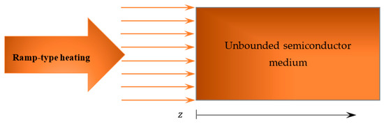 The properties of infinite, isotropic, and homogeneous semiconducting media will be studied here. A simplified representation of the proposed case is illustrated in Figure 1. It will be assumed that the studied region is initially quiet and at the reference temperature . It will be assumed that a variable-slope heat source heats the free region above the barrier . The Cartesian coordinates will be used to study the problem, with the -axis pointing in a direction perpendicular to the hot surface of the half-space. In this investigation, too, it will be taken into account that all physical fields and temperature changes occur only along the -axis direction. Thus, the displacement component operates exclusively in the z-axis i.e., .