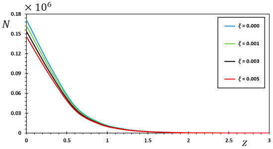 The graph in Figure 5 depicts the relationship between carrier intensity and nonlocality as depth changes. Except for the magnitude, the behavior of the carrier density is very consistent across all the different cases. With nonlocality decreasing, the effect of the nonlocality index on the carrier density profile over time appears to be weak. As the nonlocal parameter increases, the magnitude of the carrier density, , decreases.