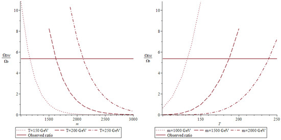 The ratio of dark and baryonic matter densities for the case of sphaleron transition when freezing out temperature is below the temperature of the EWPT: . The observed ratio plotted according to PLANCK collaboration data [31]. In this paper the equal masses approximation was used.