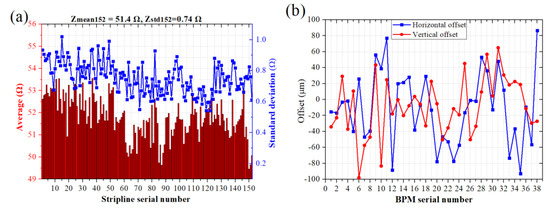 Here, Zstrip, Lstrip, and α are the characteristic impedance, longitudinal length, and cover angle of the stripline, respectively; and c is the speed of light. Ignoring the impedance matching error with the cable, the signal strength can be approximated using the characteristic impedance. The xoffset value caused by the inconsistency between electrodes A and C can be evaluated by replacing UR with ZstripR and UL with ZstripL in Equation (2). The offset results of 38 stripline BPMs are shown in Figure 2b, where yoffset could be obtained using the characteristic impedance difference between electrodes B and D. The deviations caused by electrode differences were smaller than 100 μm, which is acceptable for the accuracy requirements.