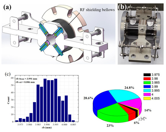 A button electrode and ultra-high vacuum (UHV) RF feedthrough were combined into a pickup, which was welded on a vacuum chamber with two RF shielding bellows on both sides. Any defect in the button requires a complete chamber replacement. For this reason, a thorough verification of the feedthrough quality is mandatory. Three important parameters, rb, Cb, and b, are directly connected to the button output signal according to Equation (4). The radius measurement results for 500 buttons are shown in Figure 3c. The STD of the radius was only 6 μm, and more than 76% (380 pieces) of the feedthroughs were concentrated at 3.990 ± 0.005 mm. A radius deviation of ±5 μm induces a position deviation of ±5 μm according to Equation (4), assuming that the other parameters are kept constant (Cb = 2.4 pF, b = 11 mm).