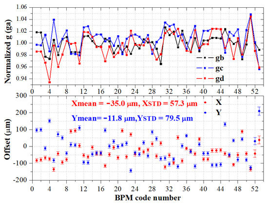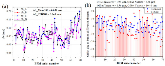 where kx = ky = 11 mm for the booster, and kx = ky = 8 mm for the storage ring. Ua is the signal strength of electrode A and can be replaced with Zt of electrode A. The offsets caused by the Δb values of the four electrodes according to Equation (5) are shown in Figure 5b. The STD of b for 280 buttons was 43 μm, and the STD values of the horizontal and vertical offsets for 70 BPMs were 7 and 11 μm, respectively.