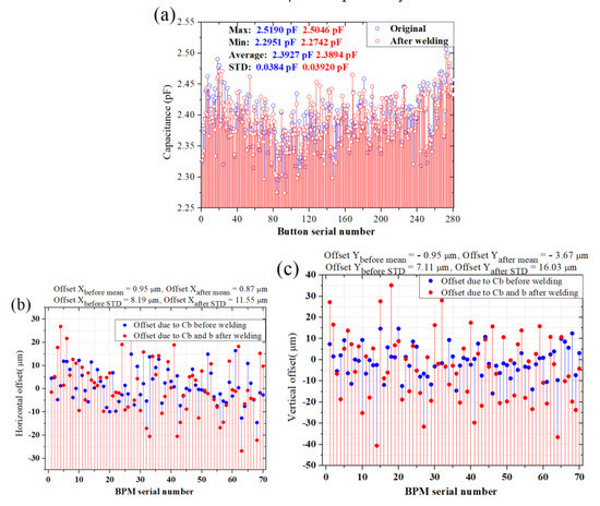 Similar to the mechanical size, the button capacitances were similar and sorted into groups. The maximum capacitance deviation allowed between the four electrodes was 0.03 pF, and the offsets corresponding to 0.03 pF were 5 and 7 μm for the booster and storage rings, respectively. Considering the button capacitance changes in the mounted configuration owing to fringe fields, we measured the button capacitance twice. The results for the 280 buttons before and after welding are shown in Figure 6a. The offsets caused by the ΔCb values are shown in Figure 6b,c, and the STD values of the 70 BPMs were 8 and 7 μm in the horizontal and vertical directions, respectively. After welding, the STD values were 12 and 16 μm, respectively, because of the dual effects of Cb and b.