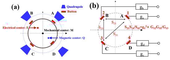 Figure 7a shows the electric and magnetic centers when quadrupole D and button D deviate from their ideal positions. We measured the electro-mechanical offset using two different methods. The first was the so-called Lambertson method [23], which is based on the scattering parameters (S-parameters) for four buttons of a BPM measured by a network vector analyzer (NVA). The transmission efficiency between buttons i and j was denoted by Sij. The process was repeated on all the buttons, and an S-parameter matrix was obtained. Ideally, the transmission should be symmetric (S12 = S21, S13 = S31...). The gain factor, gi, of each electrode can be determined by the S-parameters, and the ratios between the gain factors provide , which results in the deviation of the four channels depending on the feedthrough, BPM block, and welding processing. As shown in Figure 7b, the signals satisfy the following equation [23,24]: