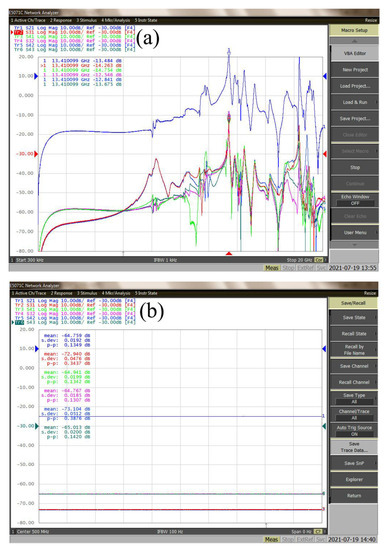 (a) S-parameters in frequency range of 300 kHz–20 GHz with IF bandwidth of 1 kHz. (b) S-parameters in a CW sweep mode at a frequency of 500 MHz, with an IF bandwidth of 100 Hz.