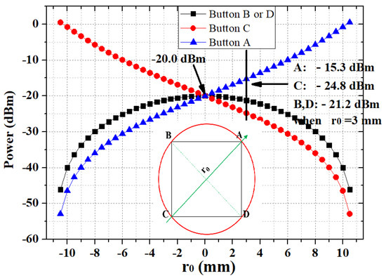To obtain fitting coefficients with a higher accuracy and smaller fitting error, , where x(y) and xfit (yfit) are the beam positions (the real positions of the stretched wire) given by Equation (6) (measured beam position), the relationship between the calibration range and fitting error was studied. In the initial preliminary commissioning phase and user’s operation phase, the beam position (orbit) may be quite different, whereas the latter will be much smaller after optical correction. The signal strengths on the pickup were also significantly different for centric and off-centered beams. Assuming that the signal strength is −20 dBm when the beam is in the center, discarding the automatic gain adjustment function, when the beam moves along the diagonal line formed by buttons A and C, the signal strength changes of the four electrodes are shown in Figure 10. The slopes of A, C and B(D) were approximately 1.6, −1.6 and −0.4 dB/mm in the central area, respectively.