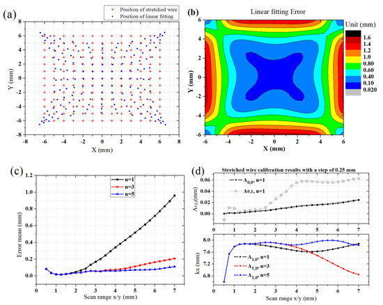 If the calibration range has been determined, the results in Figure 10 can assist in evaluating whether the ADC will be saturated based on the ADC reading when the stretched wire is in the center of the pipe when the calibration begins. Figure 11a shows the linear fitting results (xfit and yfit) of a typical HEPS storage ring BPM with a range of ±6 mm in 1 mm steps. The distribution of the fitting error, is shown in Figure 11b, where the error is smaller in the center region than in the edge area. Figure 11c shows the average values of with steps of 0.25 mm and a different fitting order, n. When x/y changes from 0.25 to 7.00 mm, the total number of scan points is 9, 25, 49, 81,..., 3249, and the time consumption of the calibration process increases exponentially. As shown in Figure 11c, the errors first decrease because the increase in the number of scan points reduces the accidental errors and then increases because of the nonlinear response of the BPMs. When the scan range increased, the error of the first-order (second-order) fitting increased rapidly, whereas the error of the high-order fitting increased much more slowly. Figure 11d shows the linear fitting results with different calibration ranges, indicating that a precise sensitivity constant, k (A1,0), could only be determined within a reasonable calibration range.