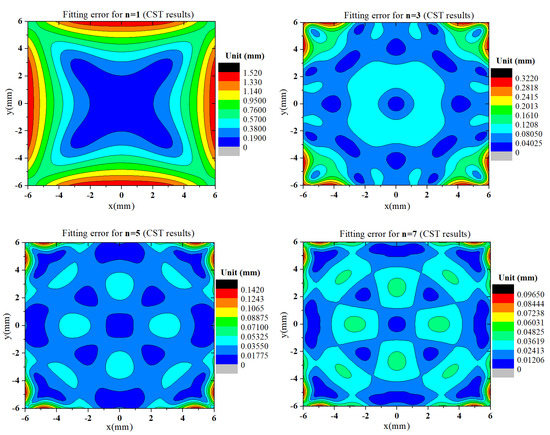 As shown in Figure 11c, the errors for the high-order fitting were much smaller than those for linear fitting, especially in a larger calibration range. To eliminate the impact of accidental errors on the BPM manufacturing process, we repeated the calibration procedure using the CST simulation in a range of ±6 mm with steps of 0.5 mm. The simulation showed that the errors were the same for n = 1 and 2, as well as for n = 3 and 4, n = 5 and 6, and n = 7 and 8. The fitting sensitivity coefficient, k, was also exactly the same (kxn=1 = kyn=1 = kxn=2 = kyn=2). Figure 12 shows that the fitting error distributions for n were 1, 3, 5, and 7. With a higher fitting order, the errors were much smaller, but there were more calibration coefficients. The number, Ai-j,j(Bi-j,j), and fitting order n satisfied
