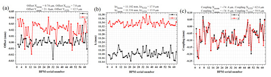 Fitting results for 62 BPMs, where n = 1, scan range = ±6 mm, and scan step = 0.5 mm: (a) offset, (b) k and (c) coupling coefficient.